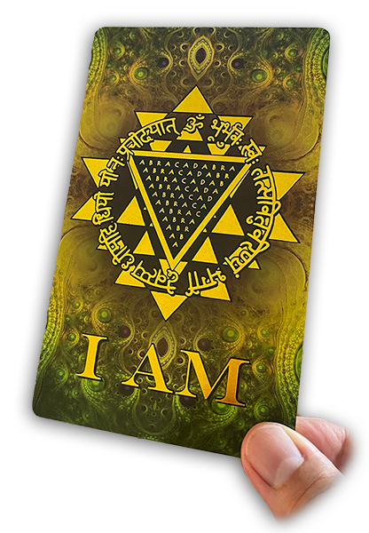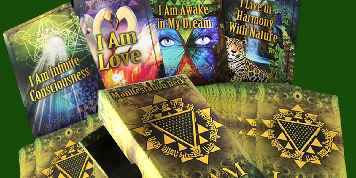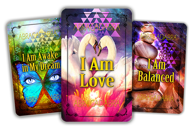 The design on the back of the cards features the Manifestation Mandala, a powerful diagram that combines spiritual tools from several traditions to help us tap into our creative potential. The mandala contains the word ABRACADABRA, an Aramaic term meaning "I CREATE AS I SPEAK", written inside of a triangle. Around the triangle written in Sanskrit, is the Gayatri Mantra overlying the Sri Yantra. Both are potent spiritual tools from the yoga tradition to purify and enlighten the mind. The I AM statement connects one with the Higher Self and the Creator.
